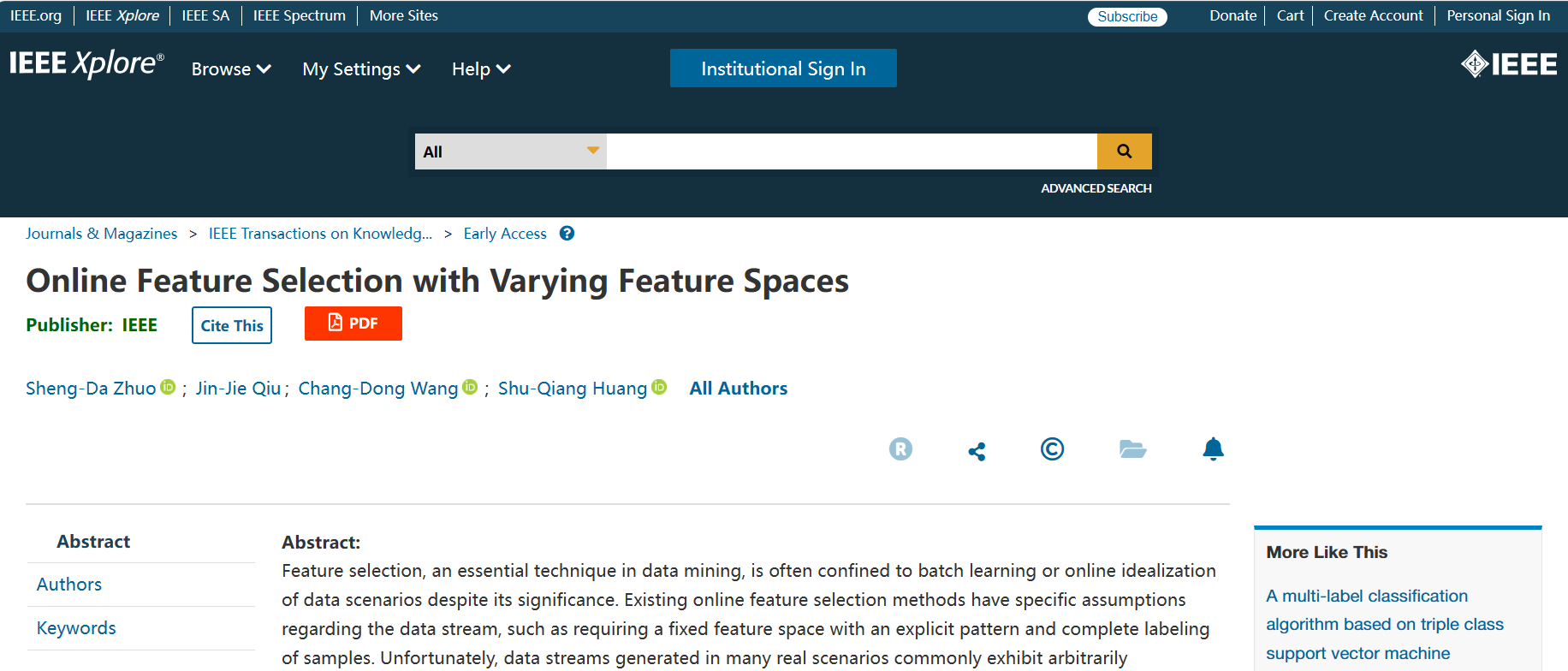 近日,公司黄书强教授课题组在数据挖掘国际顶级期刊IEEE Transactions on Knowledge and Data Engineering(TKDE)上在线发表题为“Online Feature Selection with Varying Feature Spaces”的学术论文。365英国上市博士生卓胜达为第一作者,黄书强教授为通讯作者。